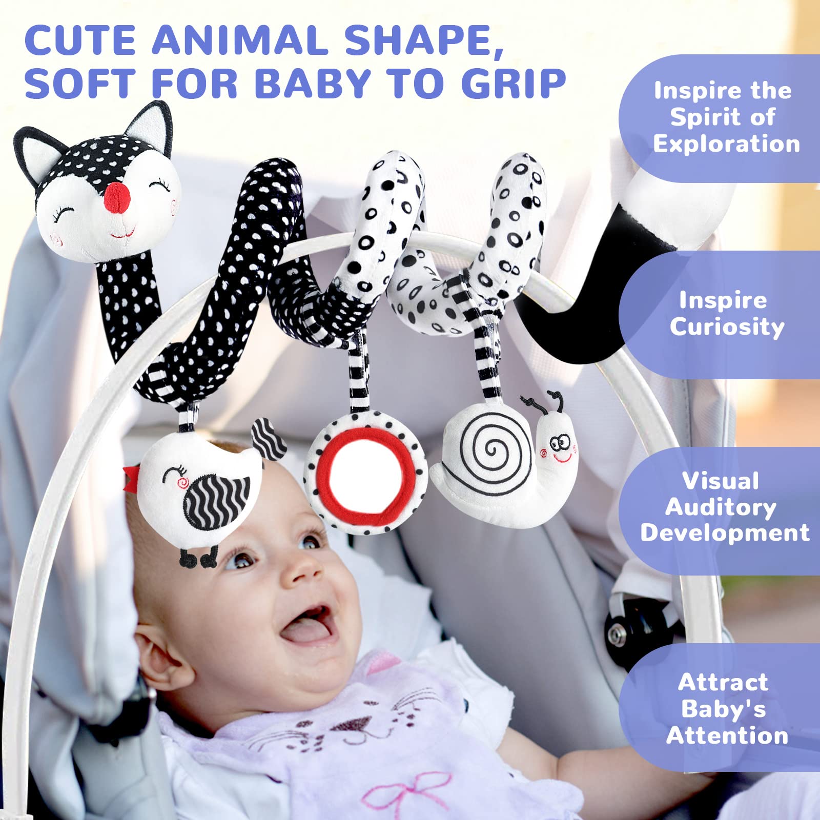 Euyecety Baby Spiral Plush Toys, Black White Stroller Toy Stretch